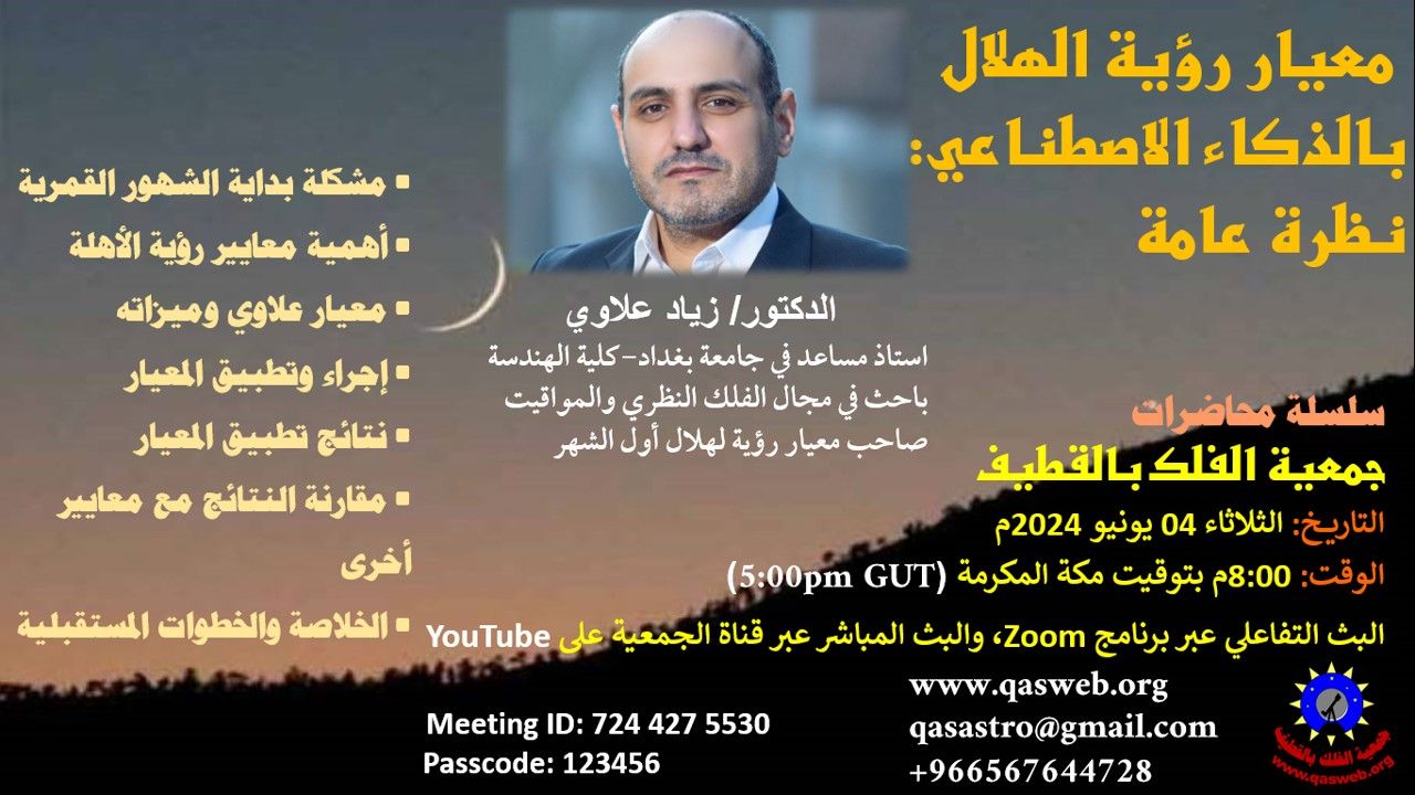 الجمعية تنظم محاضرة فلكية بعنوان (معيار رؤية الهلال بالذكاء الاصطناعي: نظرة عامة) يقدمها الدكتور زياد علاوي في مساء الثلاثاء 26 ذو القعدة (04 يونيو 2024م) عبر منصة زوم وبالبث عبر قناة الجمعية على اليوتيوب