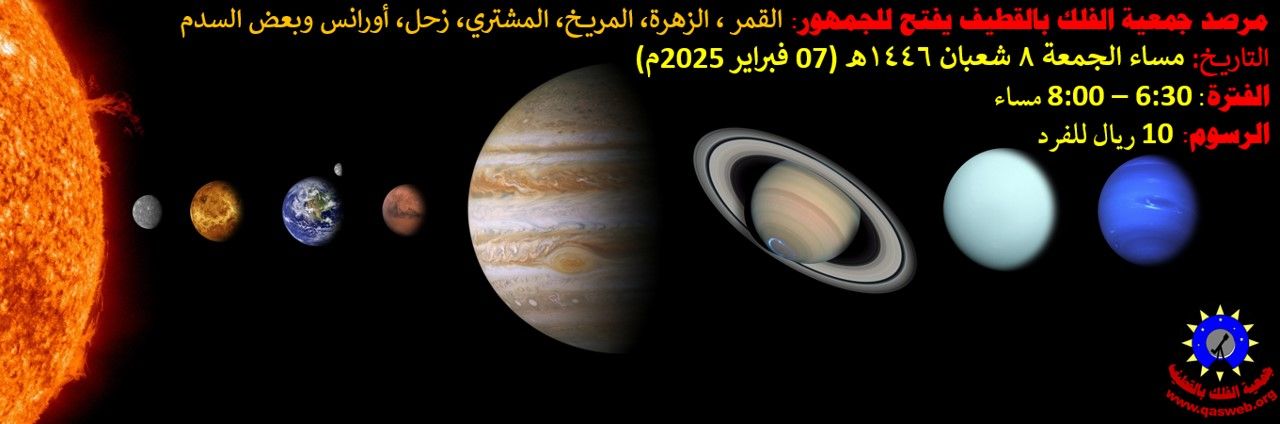 إلغاء فعالية رصد الكواكب اليوم الأحد 24 شعبان (23 فبراير 2025م) بسبب تلبد السماء بالغيوم. وسوف يتم تأجيلها إلى موعد يحدد لاحقا.