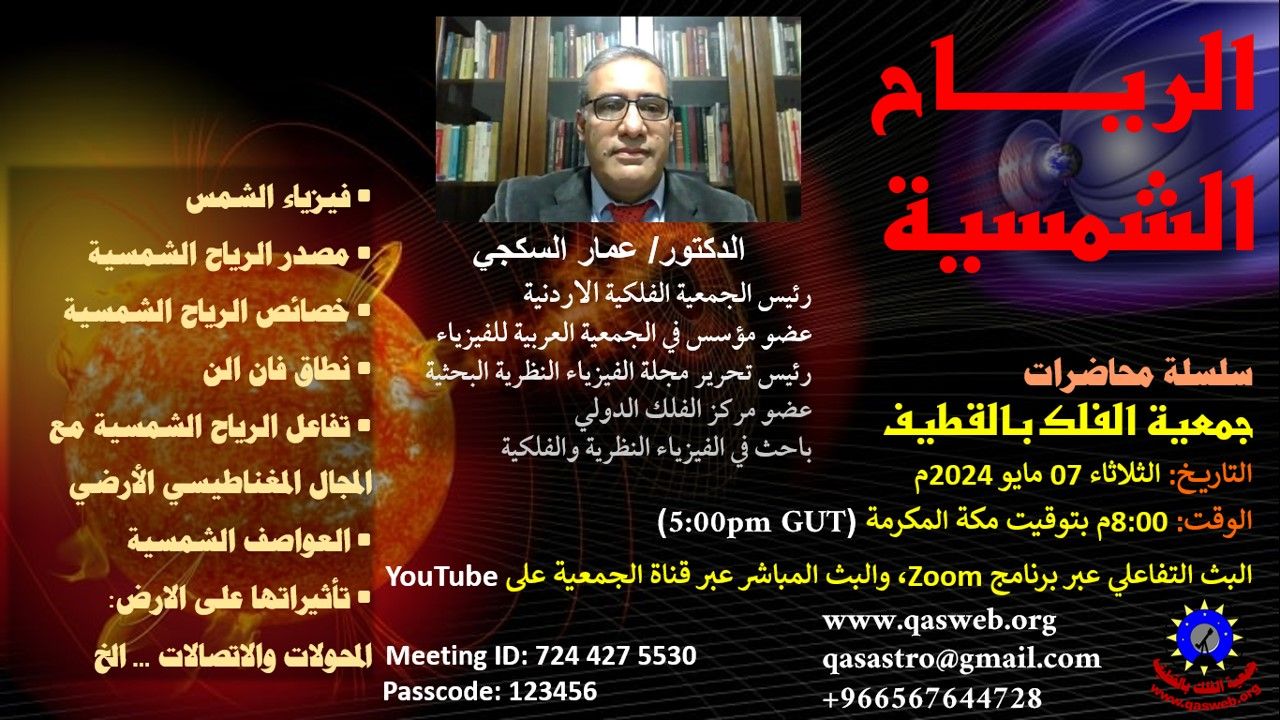 الجمعية تنظم محاضرة فلكية بعنوان (الرياح الشمسية) يقدمها الدكتور عمار السكجي في مساء الثلاثاء 28 شوال (07 مايو 2024م) عبر منصة زوم وبالبث عبر قناة الجمعية على اليوتيوب