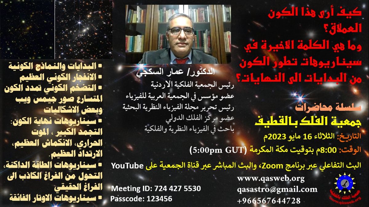 عنوان المحاضرة: كيف أرى هذا الكون العملاق؟ وما هي الكلمة الأخيرة (حتى هذا التاريخ) في سيناريوهات تطور الكون من البدايات الى النهايات؟