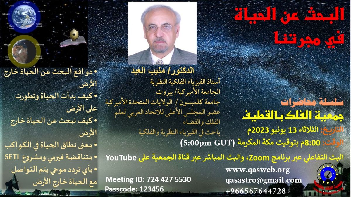 ضمن برامج وأنشطة جمعية الفلك بالقطيف في سبيل نشر الوعي الفلكي لهذا العام 1444هـ (2023م)، تنظم الجمعية محاضرة علمية عبر منصة زوم وبالبث المباشر عبر قناة الجمعية على اليوتيوب، وتفاصيل المحاضرة على النحو التالي: