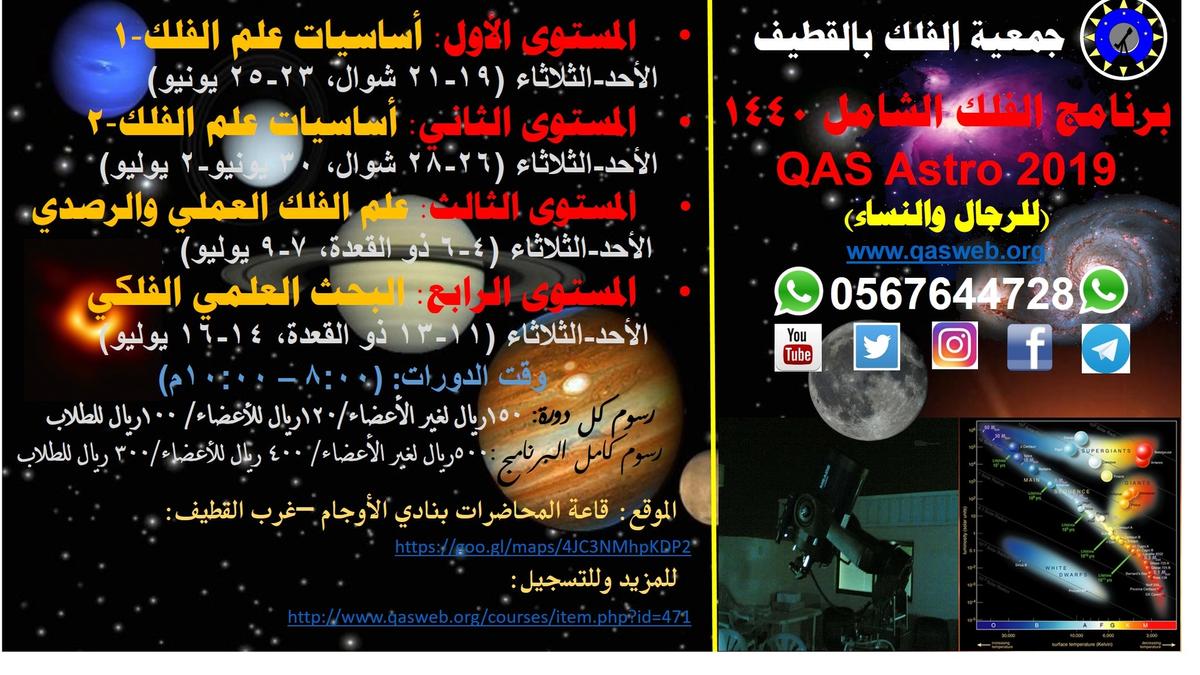 تنظم جمعية الفلك بالقطيف برنامج الفلك الشامل الصيفي للسنة الثالثة على التوالي (للرجال والنساء) ، حيث تشتمل على دراسة علم الفلك النظري والعملي ابتداءً من أساسيات الفلك وانتهاءً بإجراء البحوث الفلكية. وسوف يقوم بتقديم الدورة مجموعة من المتخصصين والمهتمين بالفلك من أعضاء الجمعية.