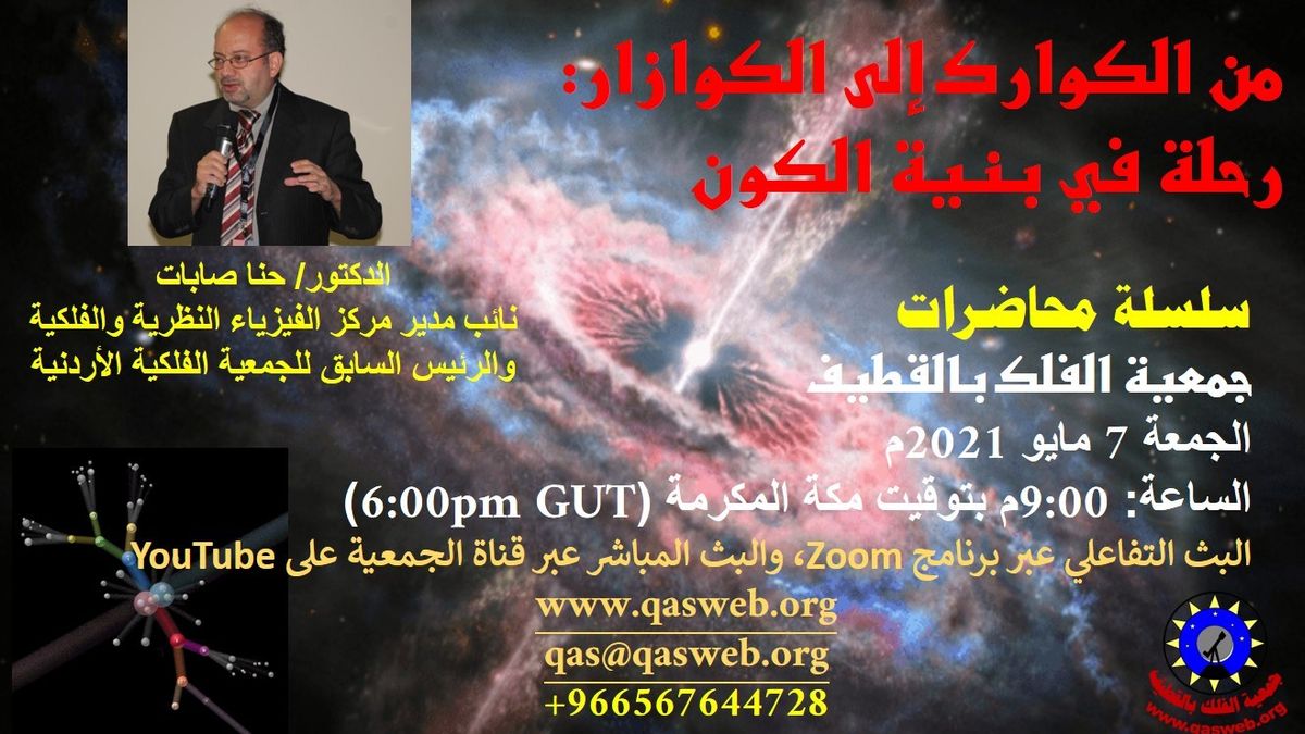 ضمن برامج وأنشطة جمعية الفلك بالقطيف في سبيل نشر الوعي الفلكي لهذا العام 1442هـ (2021م)، فإن الجمعية تنظم محاضرة علمية عبر منصة زوم وبالبث المباشر عبر قناة الجمعية على اليوتيوب، وتفاصيل المحاضرة على النحو التالي: