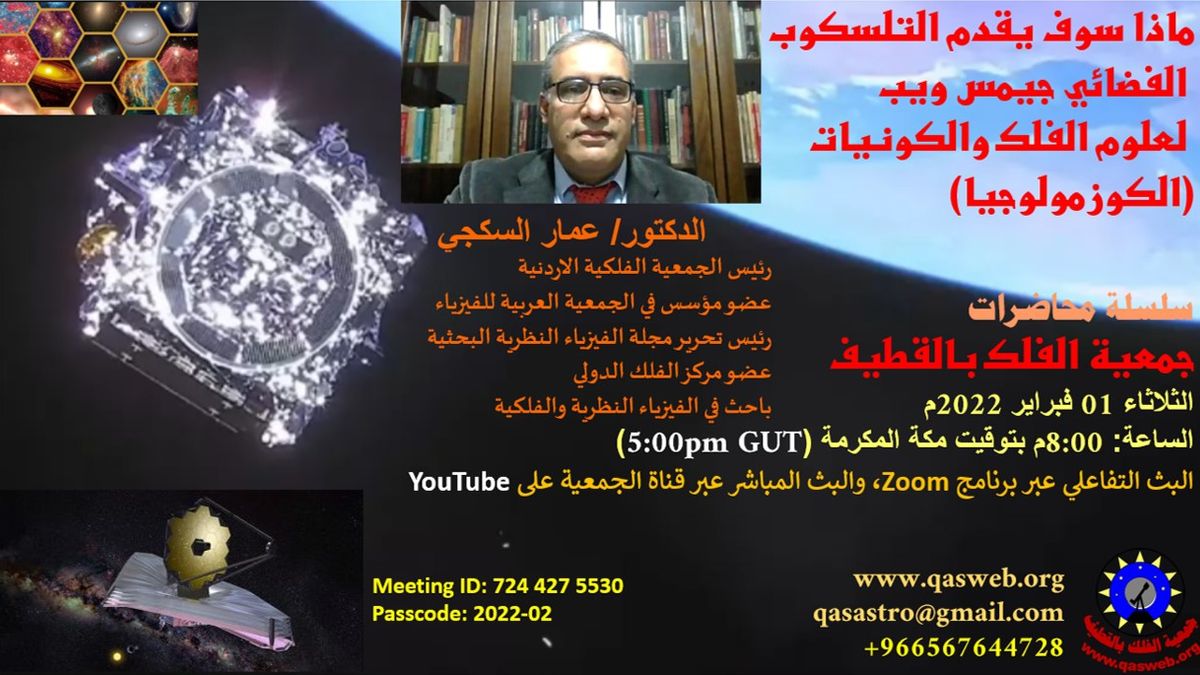 عنوان المحاضرة: جيمس ويب 2/3: ماذا سوف يقدم التلسكوب الفضائي جيمس ويب لعلوم الفلك والكوزمولوجيا