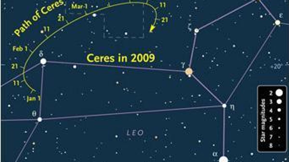 بمكن مشاهدة سيرس بواسطة المنظار المزدوج في برج الأسد وبإستخدام المخطط المرفق. ويبلغ المجال النموذجي للرؤية في المنظار المزدوج حوالي 6 دوجات (قارن ذلك بمقياس الدرجات على الحافة اليسرى من المخطط في الأعلى). كان مقدار سطوع الكويكب 7.9 في 1 يناير, و 7.2 في 1 فبراير, 6.9 في 1 مارس وسوف يكون 7.4 في 1 أبريل و 8.0 في 1 مايو. ويوضح المخطط نجوم برج الأسد حتى القدر الثامن.