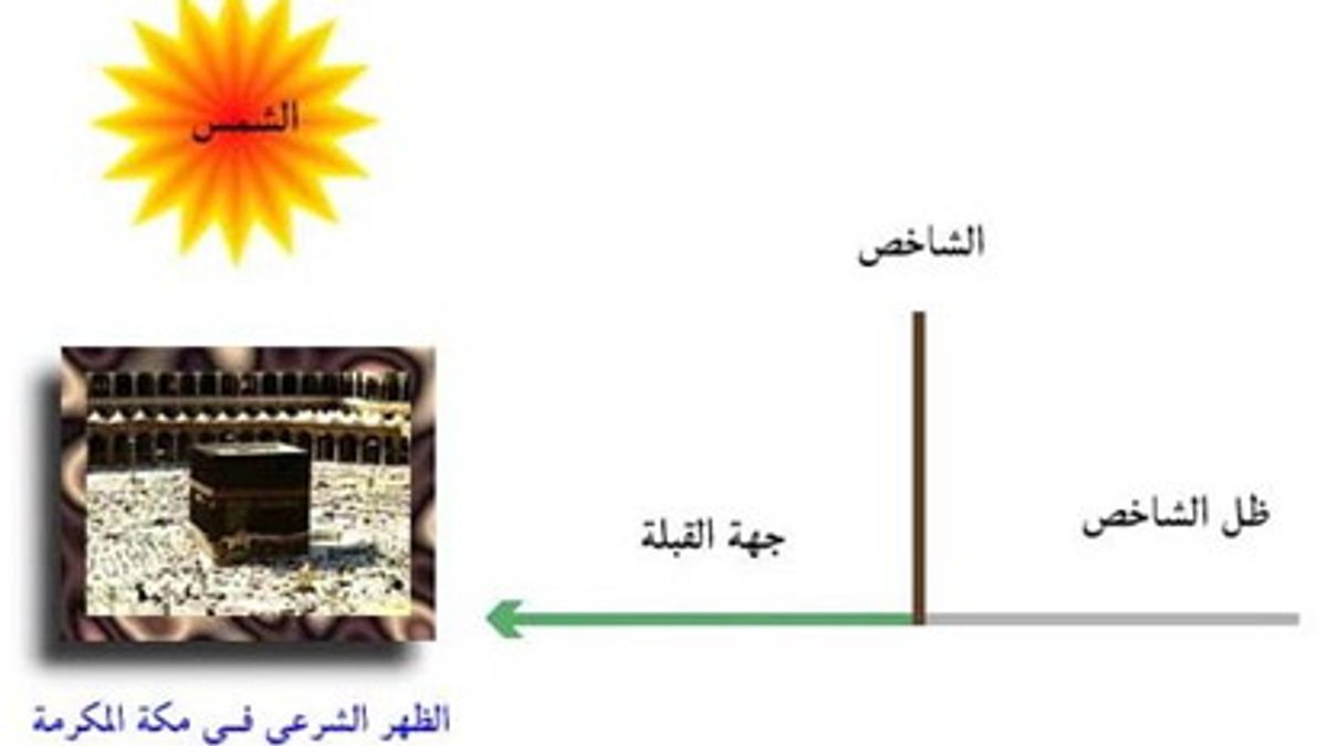 تتعامد الشمس على الكعبة المشرفة مرتان في السنة عند زوال الشمس وقت الظهر في مكة المكرمة وذلك عندما يكون ميل الشمس مساوياً لخط عرض مكة المكرمة. ويحدث ذلك يومي 28 مايو و 16 يوليو تقريبا. فإذا رصدنا الشمس لحظة تعامدها على الكعبة المشرفة فإن مركزها يكون في اتجاه الكعبة أي في اتجاه القبلة وذلك في أي مكان في العالم يمكن أن ترى فيه الشمس أي الأماكن التي تقع فيها هذه اللحظة نهاراً. وهى حوالي نصف الكرة الأرضية، ويكون سمت القبلة آنذاك هو وقت الظهر في مكة المكرمة وهى لحظة واحدة يمكن حسابها بالتوقيت المحلي لأي مدينة حيث تكون يوم 28 مايو الساعة 12:18 بتوقيت مكة المكرمة (9:18 بالتوقيت العالمي) و تكون يوم 16 يوليو الساعة 12:27 بتوقيت مكة المكرمة (9:27 بالتوقيت العالمي).
