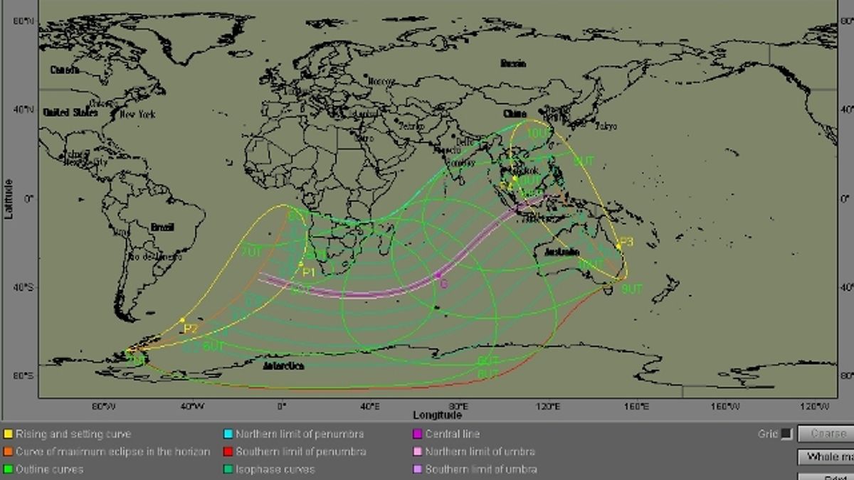 وسيبدء الكسوف الساعة 04:56 صباحا بالتوقيت العالمي ( 07:56 بالتوقيت المحلي ) ، عند الإحداثي 28:59 جنوبا و 008:17شرقا ، فيما يبلغ الكسوف ذروته الساعة 07:58 بالتوقيت العالمي ، عند الإحداثي 34:06 جنوبا و070:14 شرقا ، وينتهي الساعة 11:00 بالتوقيت العالمي عند الإحداثي 09:30 جنوبا و 104:46 شرقا.