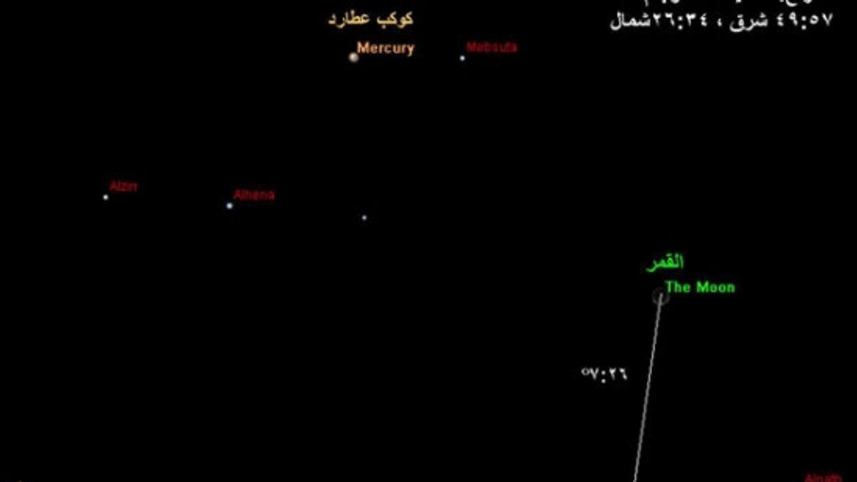 4- يصنع زاوية مع الشمس (استطالة) قدرها 7:26 درجة ويرتفع 6:30 ويكون موقع القمر بالنسبة للشمس عند غروب الشمس حسب برنامج RedShift5 كالشكل التالي: