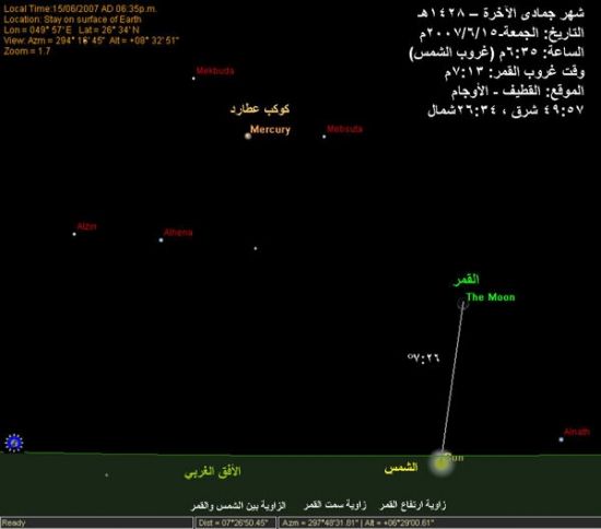 1- يكون اقتران الشمس بالقمر (ولادته فلكياً) يوم الجمعية 15 يونيو 2007م عند الساعة 6:14ص بالتوقيت المحلي (3:14ص بالتوقيت العالمي (UT)- غرينتش).