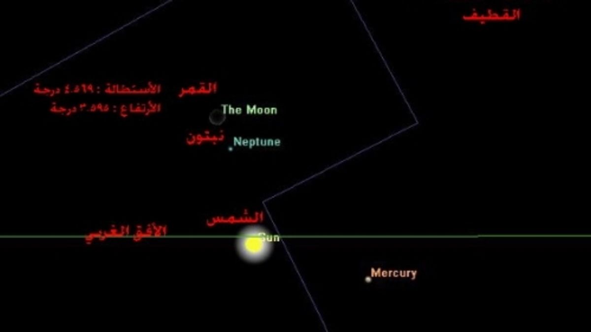 3- يصنع مركز القمر مع مركز الشمس زاوية ( الأستطالة ) 4،569 درجة ، فيما يرتفع عن الأفق 3،595 درجة .