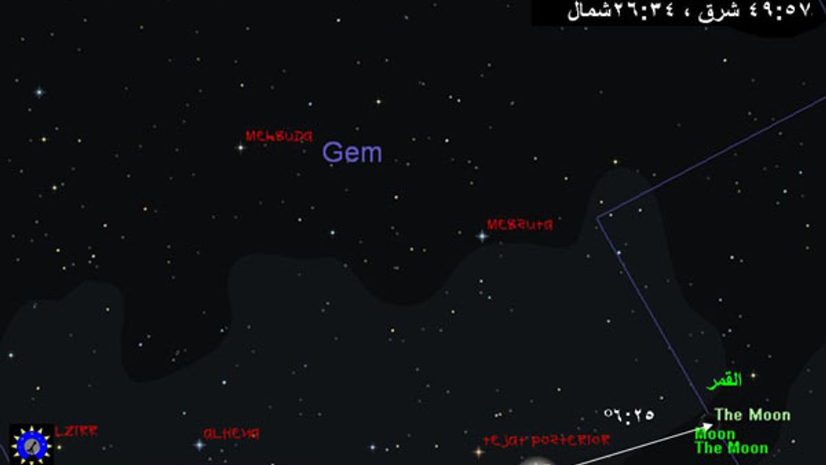 5- يصنع مركز القمر زاوية قدرها 6.4 درجات مع مركز الشمس ويرتفع بزاوية قدرها أقل من درجة عن الأفق لحظة غروب الشمس. ويكون موقع القمر بالنسبة للشمس عند غروب الشمس حسب برنامج RedShift4 كالشكل التالي: