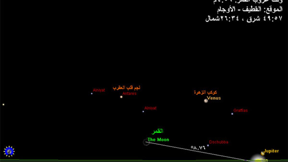 4- يصنع مركز القمر زاوية قدرها 19.45 درجة مع مركز الشمس ويرتفع عن الأفق بزاوية قدرها 9.7 درجة تقريباً لحظة غروب الشمس. ويكون موقع القمر بالنسبة للشمس عند غروب الشمس حسب برنامج RedShift5 كالشكل التالي