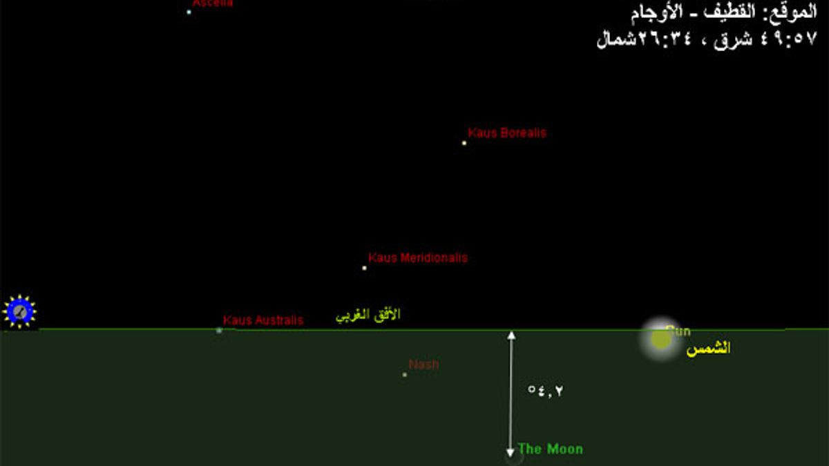4- يصنع مركز القمر زاوية قدرها 12.55 درجة مع مركز الشمس ويرتفع عن الأفق بزاوية قدرها 6.8 درجة تقريباً لحظة غروب الشمس. ويكون موقع القمر أسفل يسار كوكب الزهرة الذي يبدو واضحاً بعد الغروب بزواية قدرها 4.5 درجة أي بعرض ثلاثة أصابع لليد الممدودة. ويكون موقع القمر بالنسبة للشمس عند غروب الشمس حسب برنامج كالشكل التالي RedShift5: