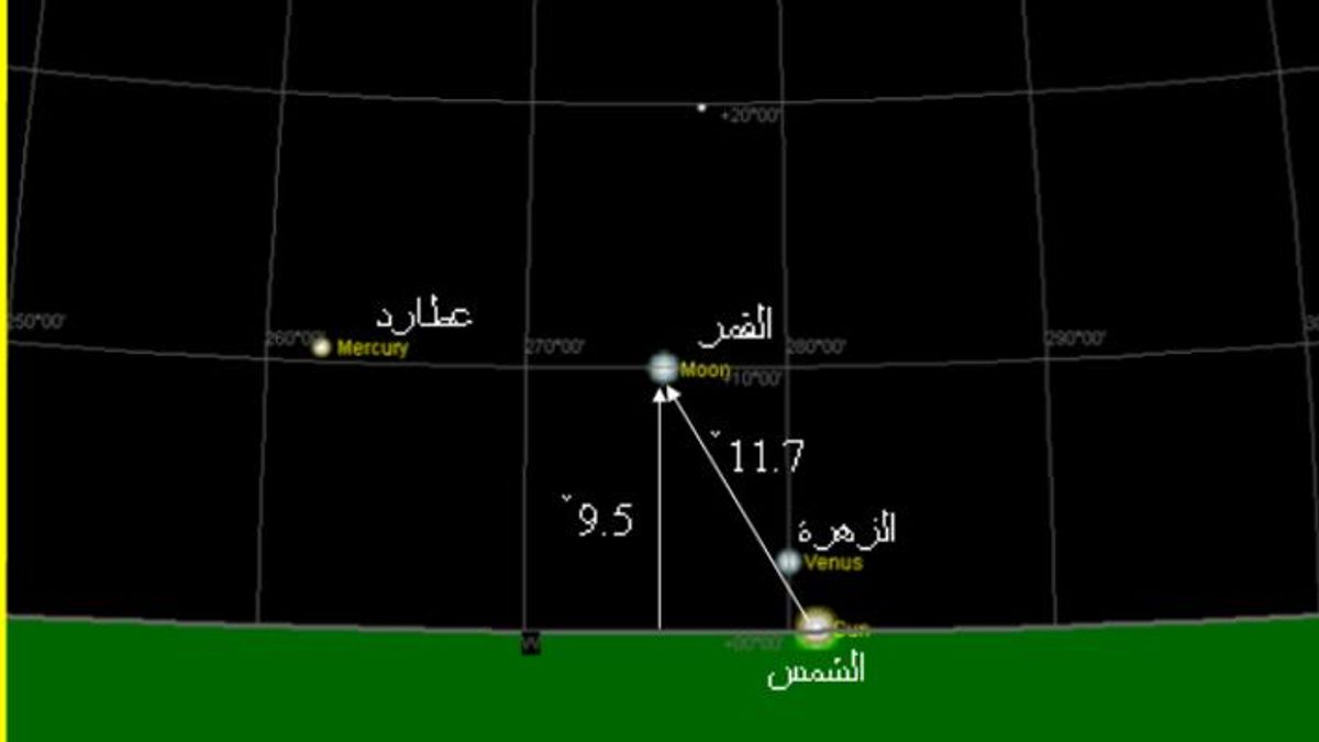 5- تكون الزاوية بين الهلال والشمس 11 درجة 45 دقيقة وارتفاعه الهلال عن الأفق 9 درحات 26 دقيقة تقريباً.
