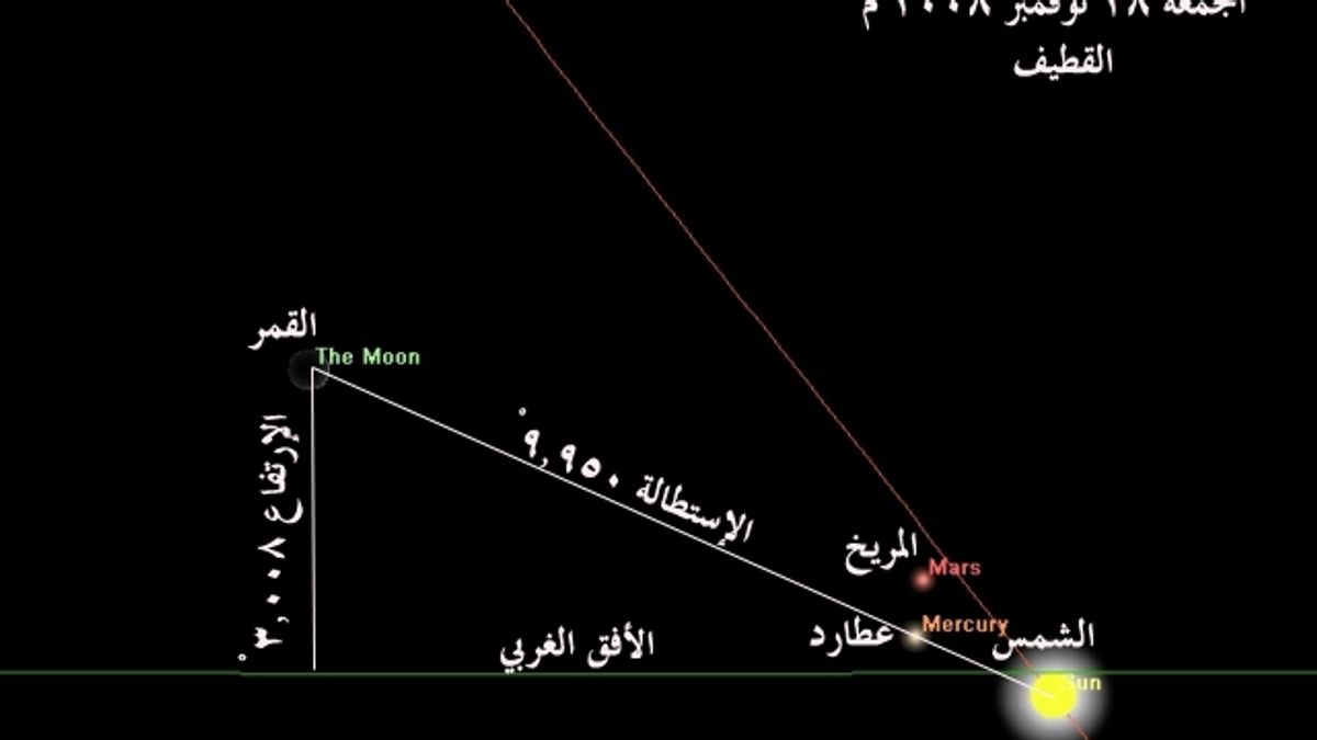 3- يصنع مركز القمر زاوية مع مركز الشمس (استطالة)، كما يحددها برنامج تقويم الجمعية، قدرها9.950 درجة ويرتفع عن الأفق 3.008 درجة ويكون موقع القمر بالنسبة للشمس عند غروب الشمس حسب برنامج RedShift 6.0.6 كالشكل التالي: