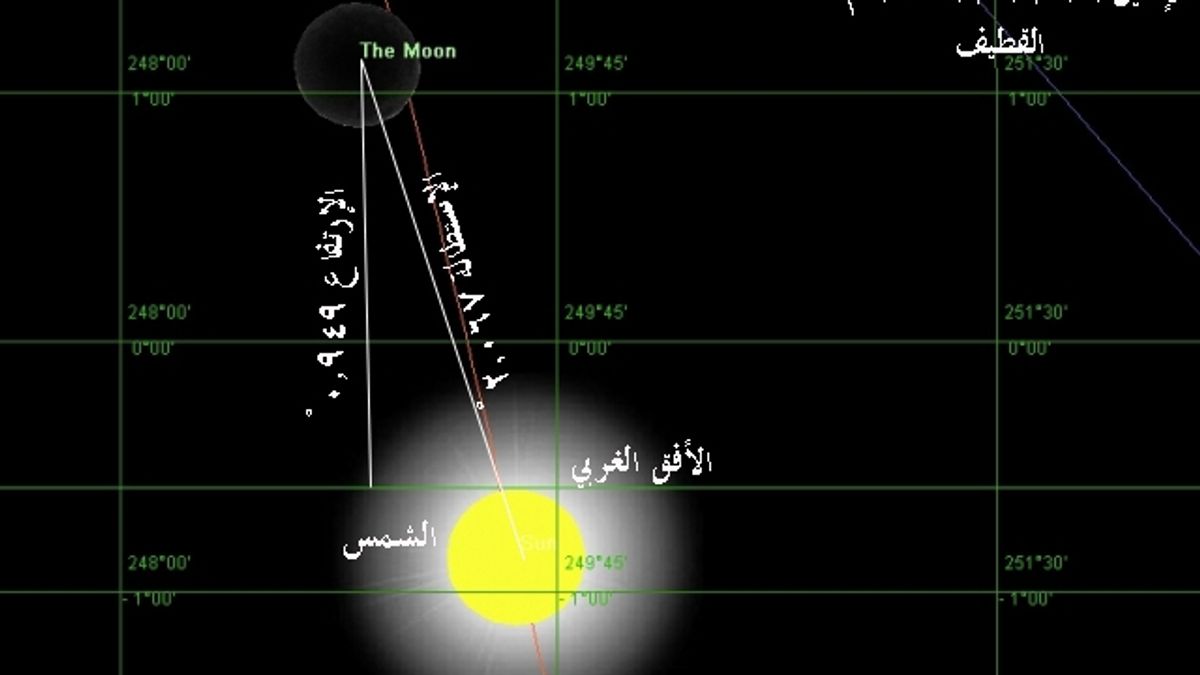 -3 يصنع مركز القمر زاوية مع مركز الشمس (استطالة)، كما يحددهابرنامج تقويم الجمعية، قدرها 13.251 درجةويرتفع عن الأفق 12.084 درجة ويكون موقع القمر بالنسبة للشمس عند غروب الشمس حسببرنامج RedShift 6.0.6 كالشكلالتالي: