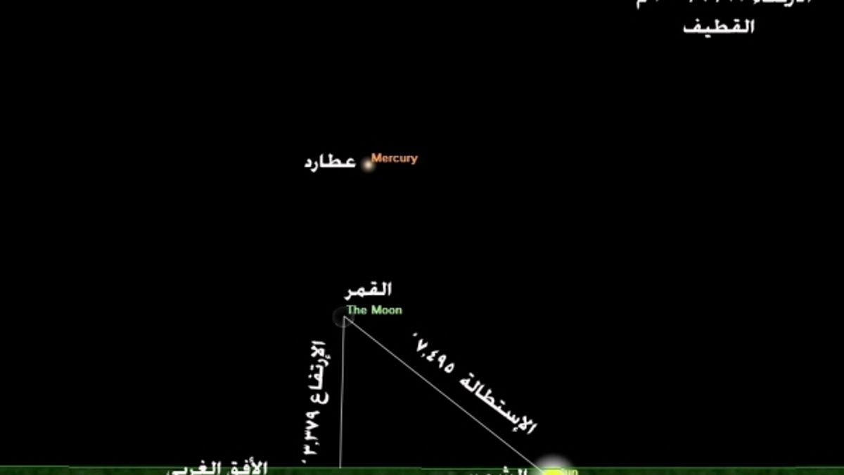 3- يصنع مركز القمر زاوية مع مركز الشمس (استطالة)، كما يحددها تقويم الجمعية ، قدرها 7.495 درجة ويرتفع عن الأفق 3.379 درجة ويكون موقع القمر بالنسبة للشمس عند غروب الشمس حسب برنامج RedShift 6.0.6 كالشكل التالي: