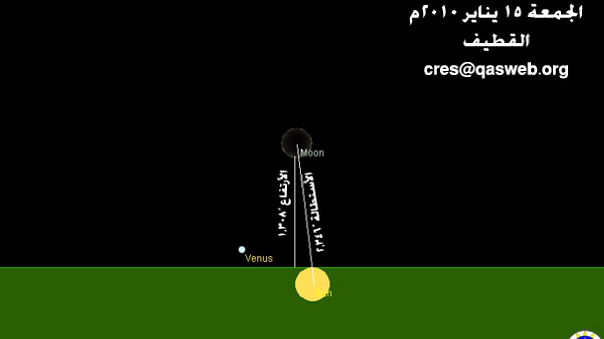 3- يصنع مركز القمر زاوية مع مركز الشمس (استطالة)، كما يحددها برنامج تقويم الجمعية، قدرها 02:346 درجة ويرتفع عن الأفق 01.308 درجة ويكون موقع القمر بالنسبة للشمس عند غروب الشمس حسب برنامج Redshift 4 كالشكل التالي: