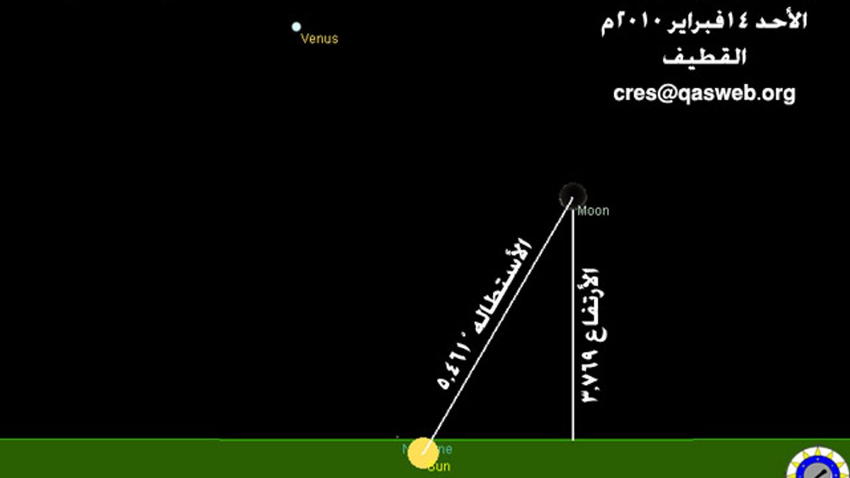 3- يصنع مركز القمر زاوية مع مركز الشمس (استطالة)، كما يحددها برنامج تقويم الجمعية، قدرها 15:817 درجة ويرتفع عن الأفق 14.679 درجة ويكون موقع القمر بالنسبة للشمس عند غروب الشمس حسب برنامج Redshift 4 كالشكل التالي: