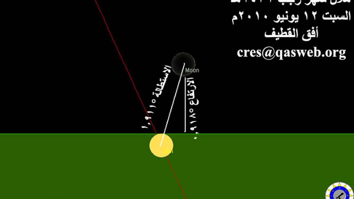 3- يصنع مركز القمر زاوية مع مركز الشمس (استطالة)، كما يحددها برنامج تقويم الجمعية، قدرها °14.787 درجة ويرتفع عن الأفق °12.242 درجة ويكون موقع القمر بالنسبة للشمس عند غروب الشمس حسب برنامج Redshift 4 كالشكل التالي: