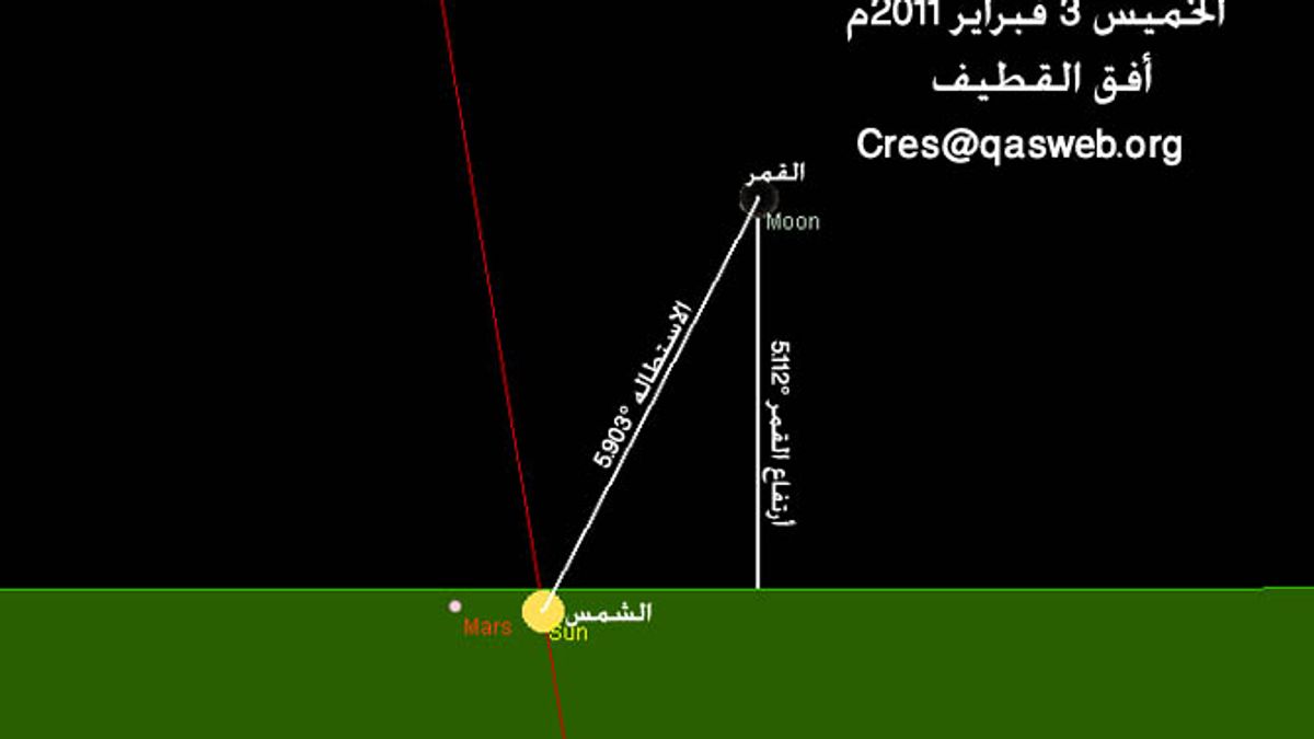 3- يصنع مركز القمر زاوية مع مركز الشمس (استطالة)، كما يحددها برنامج تقويم الجمعية، قدرها °8.183 درجة ويرتفع عن الأفق °7.553 درجة ويكون موقع القمر بالنسبة للشمس عند غروب الشمس حسب برنامج Redshift 4 كالشكل التالي: