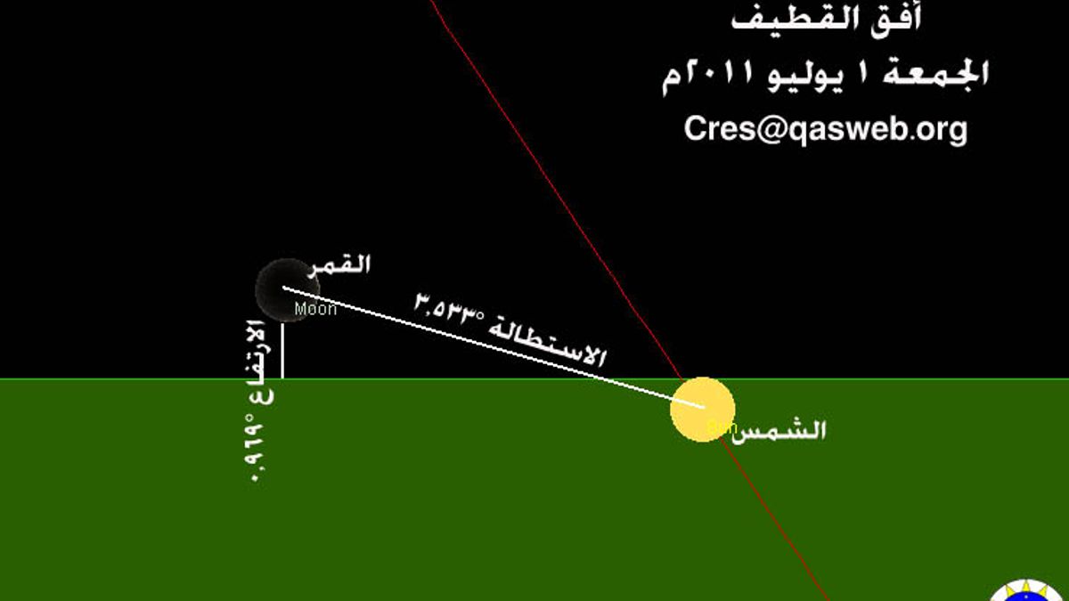 3- يصنع مركز القمر زاوية مع مركز الشمس (استطالة)، كما يحددها برنامج تقويم الجمعية، قدرها °15.689 درجة ويرتفع عن الأفق °10.682 درجة ويكون موقع القمر بالنسبة للشمس عند غروب الشمس حسب برنامج Redshift 4 كالشكل التالي: