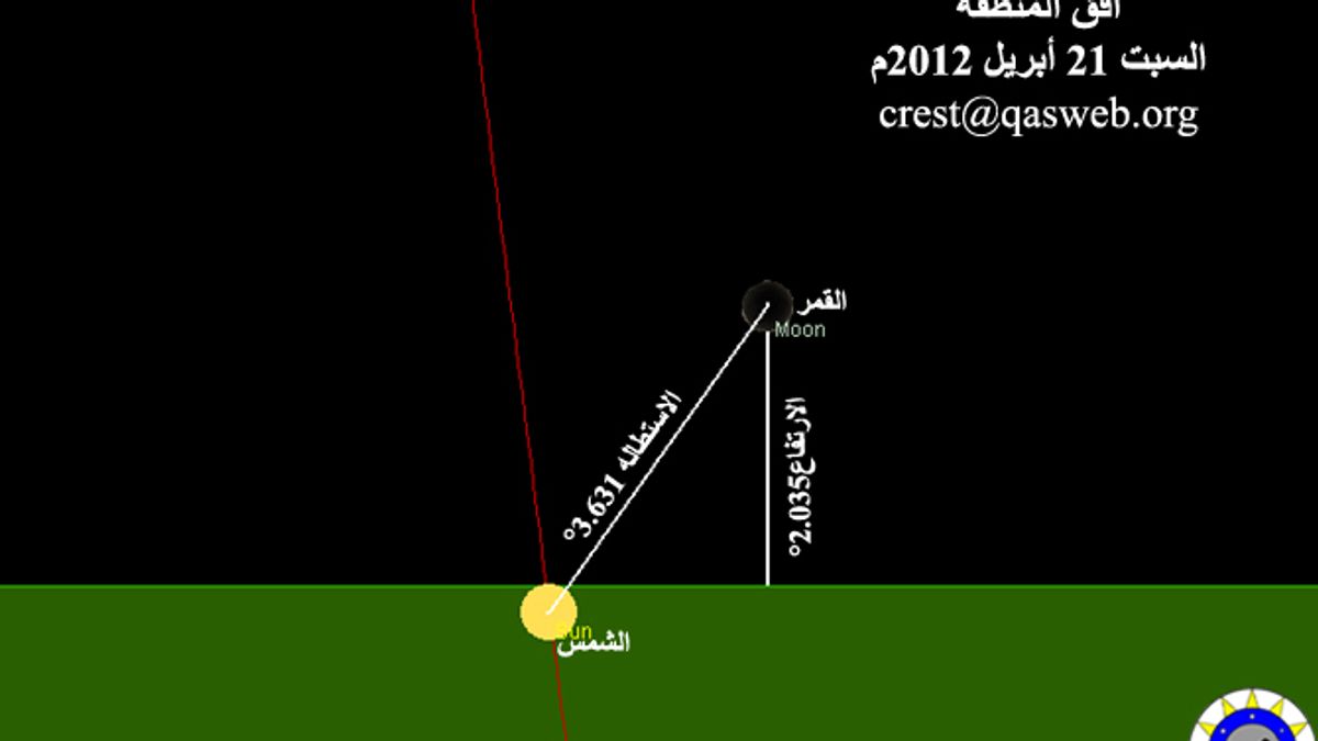 3- يصنع مركز القمر زاوية مع مركز الشمس (استطالة)، كما يحددها برنامج تقويم الجمعية، قدرها 13.587 درجة ويرتفع عن الأفق 12.684 درجة ويكون موقع القمر بالنسبة للشمس عند غروب الشمس حسب برنامج Redshift 4 كالشكل التالي: