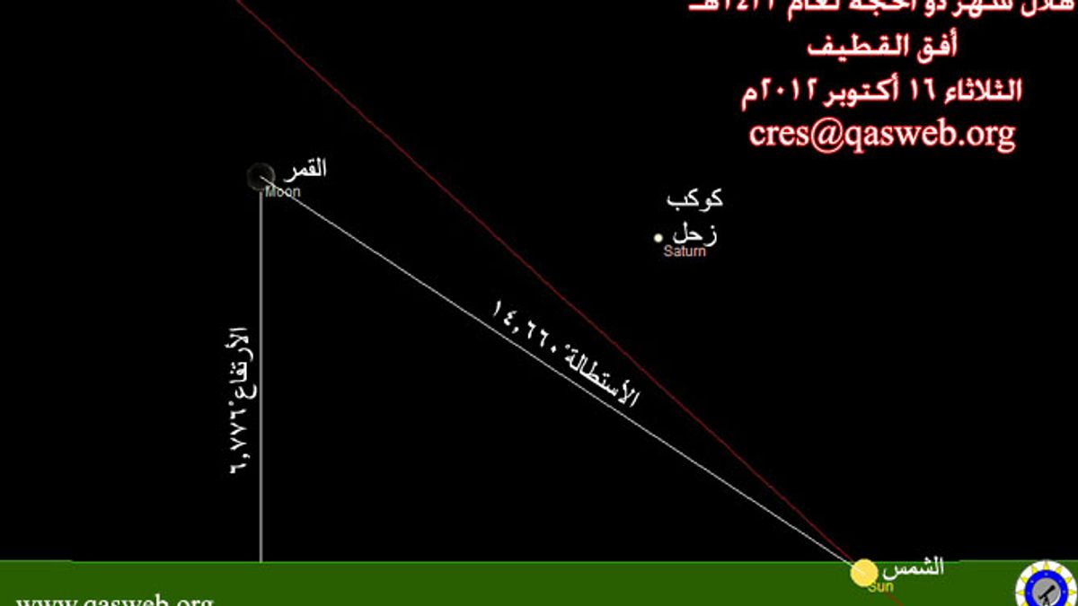 3- يصنع مركز القمر زاوية مع مركز الشمس (استطالة)، كما يحددها برنامج تقويم الجمعية، قدرها 28.459 درجة ويرتفع عن الأفق 16.750 درجة ويكون موقع القمر بالنسبة للشمس عند غروب الشمس حسب برنامج Redshift 4 كالشكل التالي: