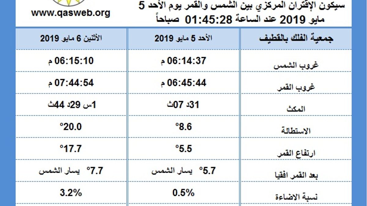 صفات هلال شهر رمضان 1440هـ والنتيجة المتوقعة لرؤية الهلال في المنطقة كما يظهرها برنامج تقويم الجمعية