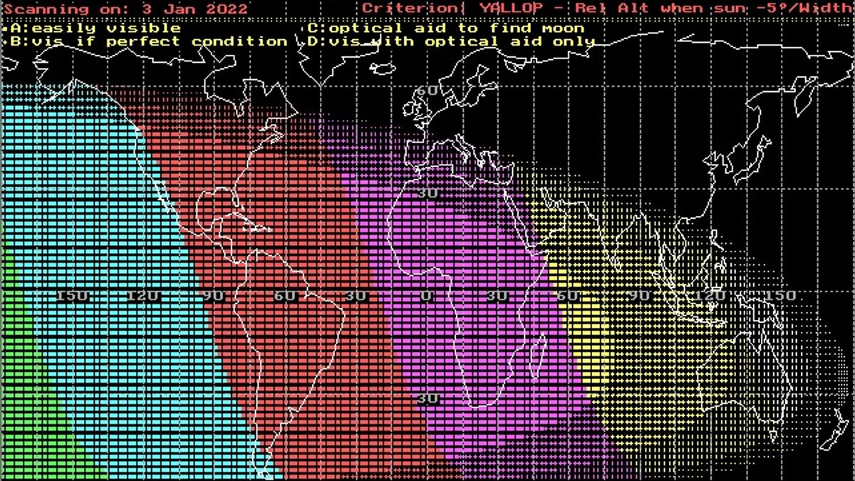 وربما تبدأ إمكانية الرؤية بالعين المجردة من المحيط الهندي شرق القارة الأفريقية بحسب معايير يالوب كما في الشكل أدناه: