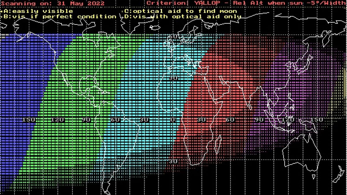 ورؤية الهلال بالعين المجردة مستبعدة في كل مناطق العالم تقريبا في هذا اليوم حسب معيار يالوب. كما في الشكل أدناه: