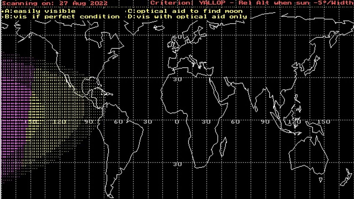 وربما يتم رؤية الهلال في هذا اليوم من المحيط الهادي في غرب القارة الأميركية، حسب معيار يالوب. كما في الشكل أدناه: