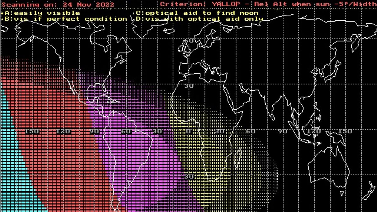 إن شاء الله ستكون رؤية الهلال بالعين المجردة بهذه الخصاص ممكنة بسهولةفي المنطقة حسب معايير الجمعية وذلك عند توفر الظروف الجوية المناسبة. وكذلك الحال في أغلب مناطق العالم حسب معيار يالوب.