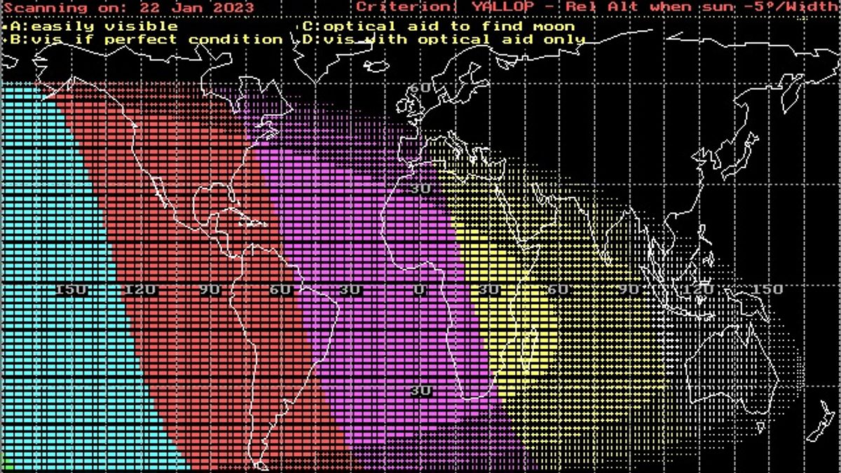 وربما تبدأ رؤية الهلال بالعين المجردة في هذا اليوم من شرق قارة أفريقيا، حسب معيار يالوب. كما في الشكل أدناه: