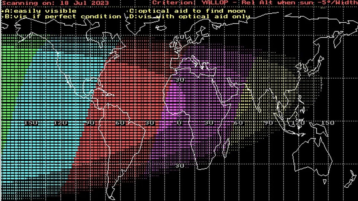 وتبدأ رؤية الهلال بالعين المجردة في هذا اليوم من غرب القارة الأفريقية حسب معيار يالوب. كما في الشكل أدناه: