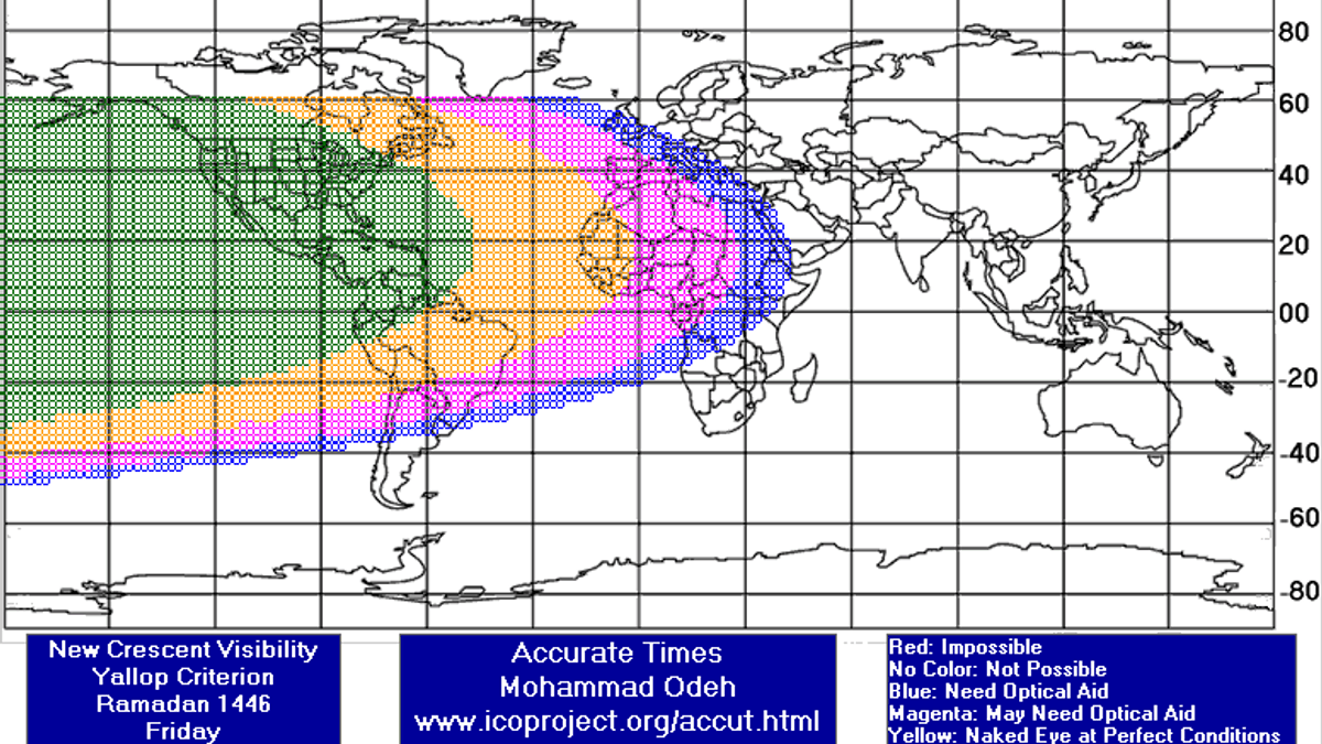 وربما يمكن رؤية الهلال بالعين المجردة في هذا اليوم من وسط القارة الأميركية، كما في خارطة الرؤية (التي تم رسمها ببرنامج المواقيت الدقيقة) أدناه حسب معيار يالوب: