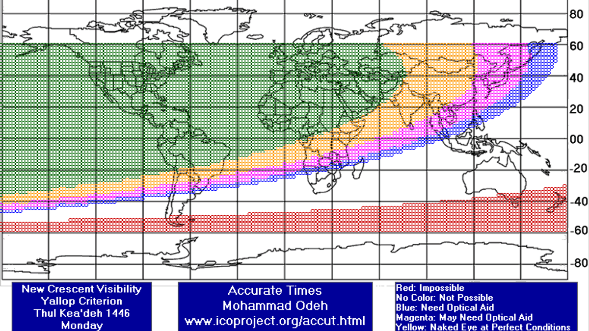 وربما يمكن رؤية الهلال بالعين المجردة في هذا اليوم من وسط آسيا، كما في خارطة الرؤية (التي تم رسمها ببرنامج المواقيت الدقيقة) أدناه حسب معيار يالوب: