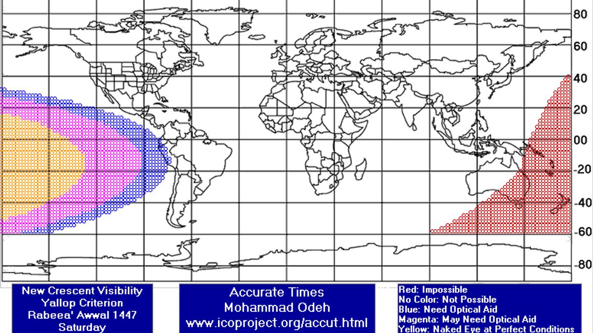وربما يستبعد رؤية الهلال بالعين المجردة في هذا اليوم من مختلف مناطق العالم، كما في خارطة الرؤية (التي تم رسمها ببرنامج المواقيت الدقيقة) أدناه حسب معيار يالوب: