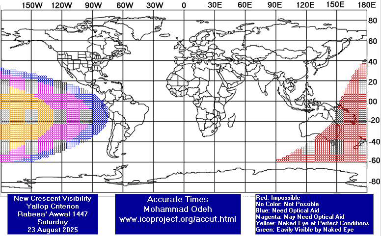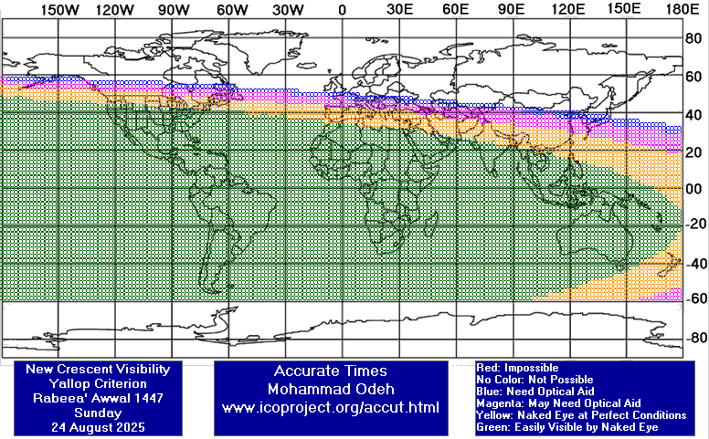 وربما يستبعد رؤية الهلال بالعين المجردة في هذا اليوم من مختلف مناطق العالم، كما في خارطة الرؤية (التي تم رسمها ببرنامج المواقيت الدقيقة) أدناه حسب معيار يالوب: