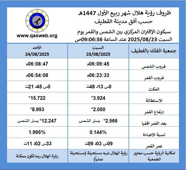 صفات هلال شهر ربيع الأول 1447هـ والنتيجة المتوقعة لرؤية الهلال في المنطقة كما يظهرها برنامج تقويم الجمعية