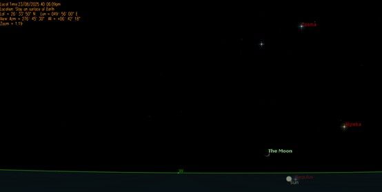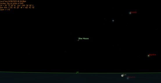 موضع الهلال بالنسبة للشمس في المنطقة عند الغروب كما يتضح ذلك من برنامج REDSHIFT 7 في الشكل التالي: