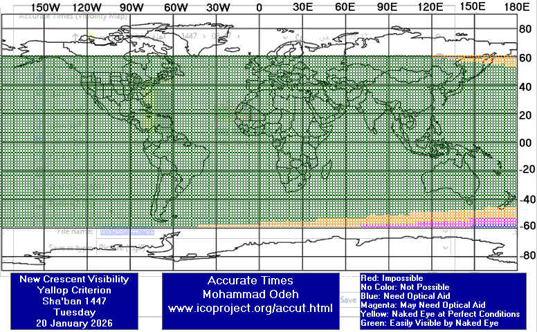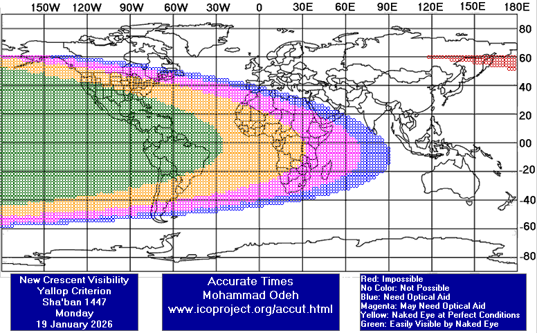 وقد تبدأ رؤية الهلال بالعين المجردة في هذا اليوم من وسط القارتين الأميركيتين، كما في خارطة الرؤية (التي تم رسمها ببرنامج المواقيت الدقيقة) أدناه حسب معيار يالوب: