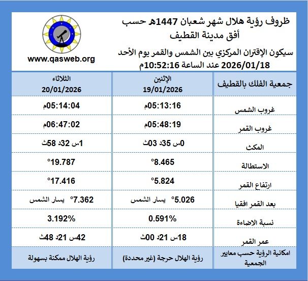 صفات هلال شهر شعبان 1447هـ والنتيجة المتوقعة لرؤية الهلال في المنطقة كما يظهرها برنامج تقويم الجمعية