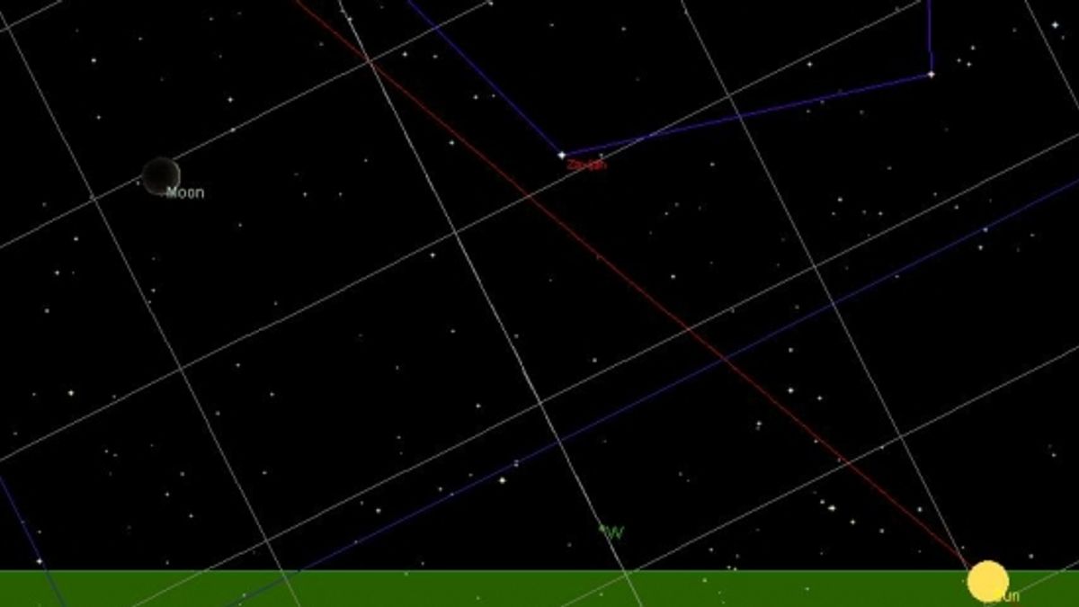 4- يصنع زاوية مع الشمس (استطالة) قدرها 12 ْ درجة ويرتفع 4:5 ويكون موقع القمر بالنسبة للشمس عند غروب الشمس حسب برنامج RedShift4 كالشكل التالي: