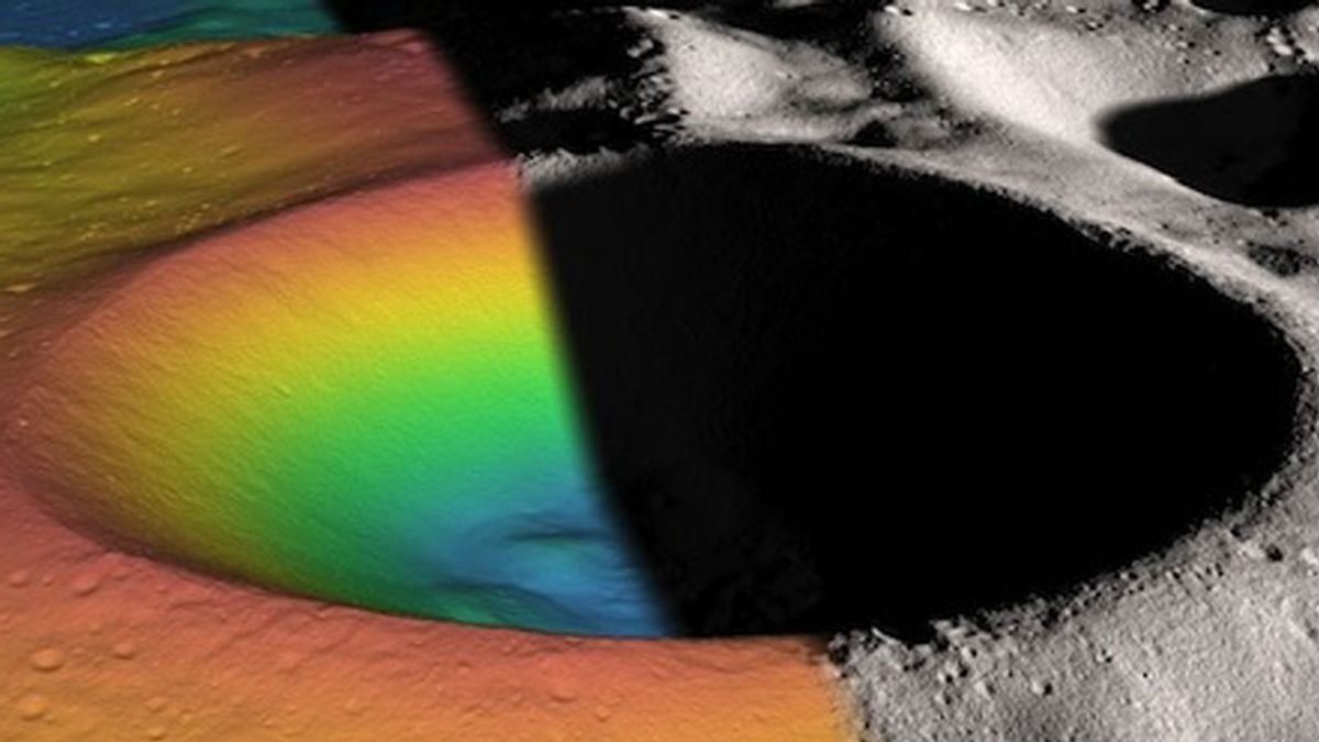 فوهة شاكلتون حيث تظهر التضاريس السالبة (يسار) والموجبة (يمين).