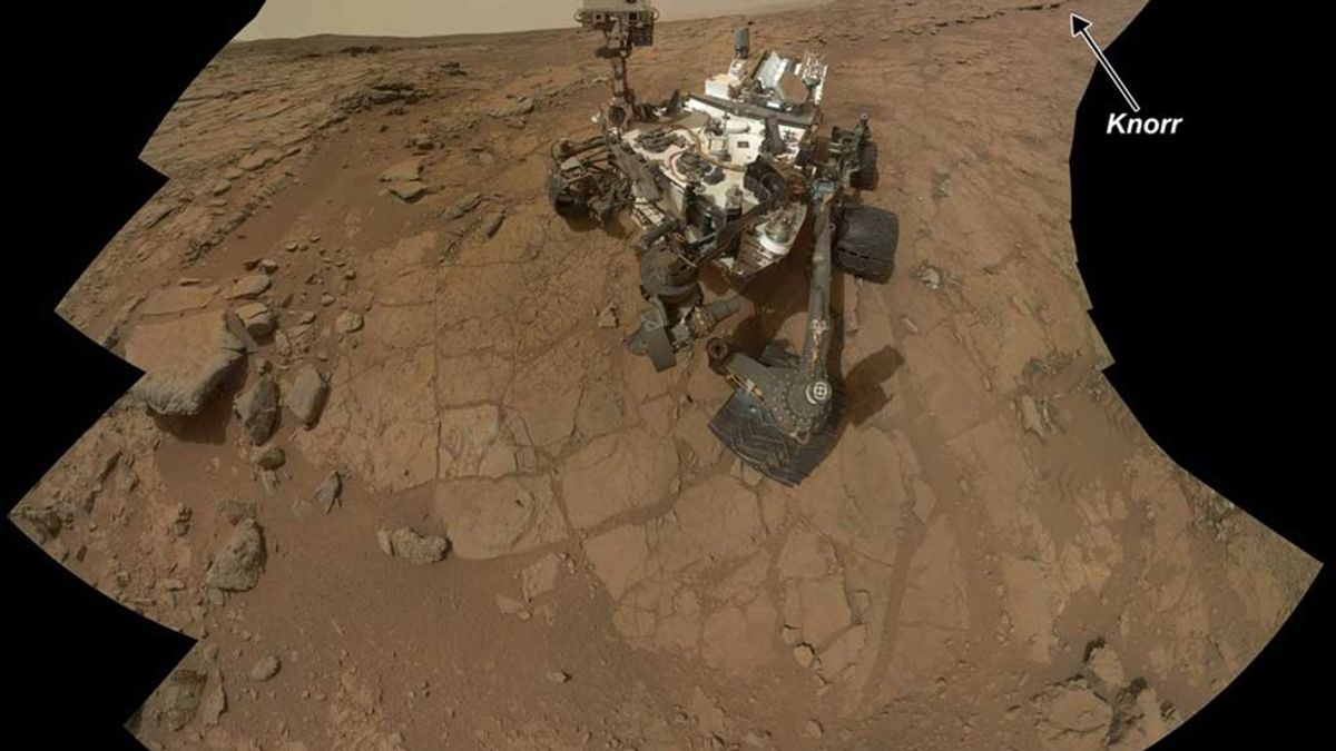 يشير السهمفي الصورة إلى صخور Knorr والتي من المقرر أن تكون من آهداف المركبة الآلية "روفر".