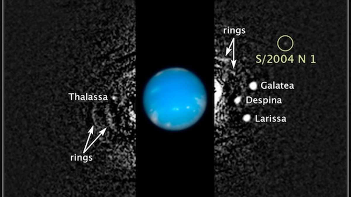 يظهر في هذه الصورة المعالجة موقع القمر الجديد S/2004 N 1 من خلال التلسكوب الفضائي هابل والتي أخذت عام 2009 م.