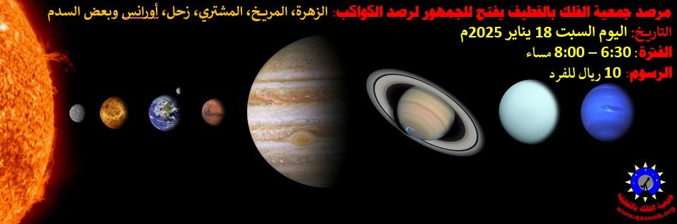 الجمعية تفتح مرصدها للجمهور اليوم السبت 18 يناير 2025م الساعة 6:30م لرصد الكواكب: الزهرة، المريخ، المشتري، زحل، أورانس وبعض السدم