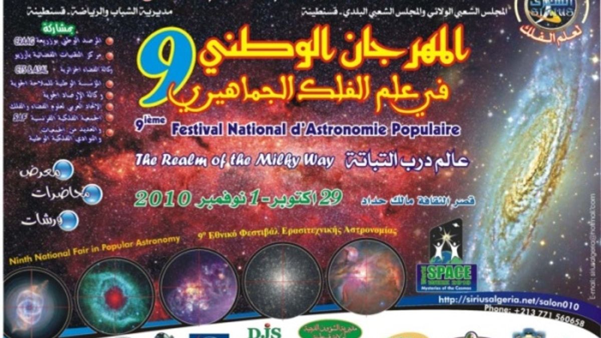 تحتضن مدينة قسنطينة المهرجـان الوطني التاسـع في علم الفلك الجماهيري، وذلك في الفترة ما بين 29 أكتوبر-01 نوفمبر2010. هذا المهرجان في نسخته التاسـعة، مفتوح للفلكيين الهواة والمختصين الجزائريين والإخوة العرب والأجانب، بالتنسيق مع الاتحاد العربي لعلوم الفضاء والفلك.
